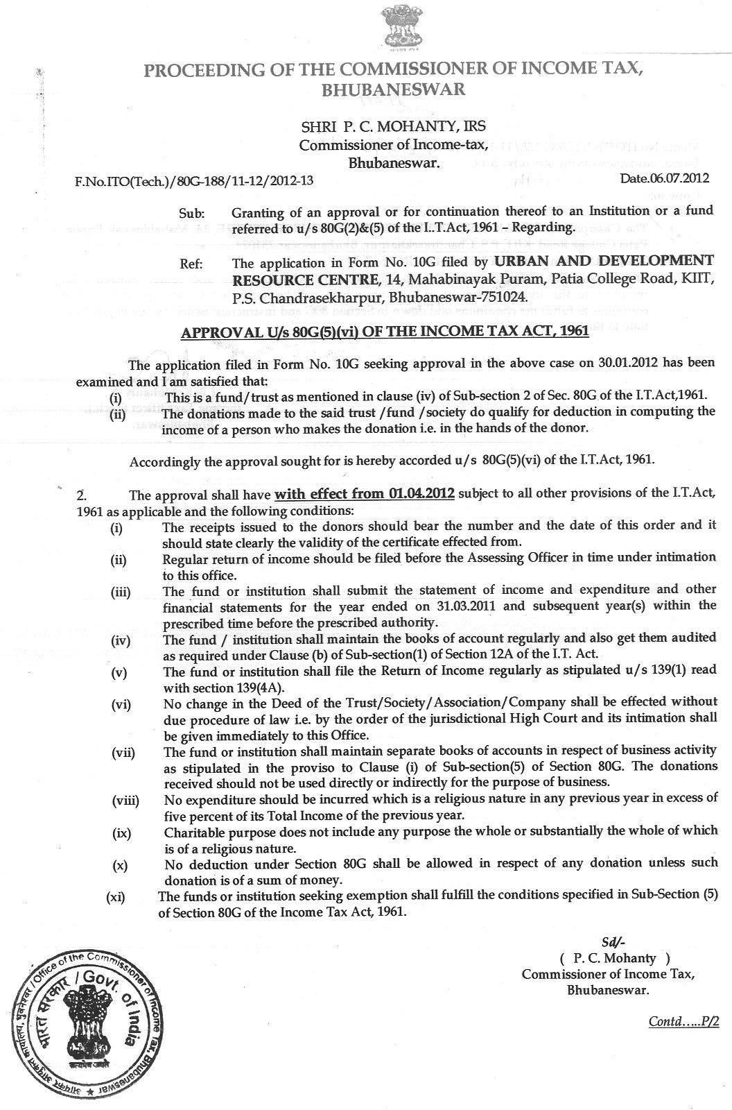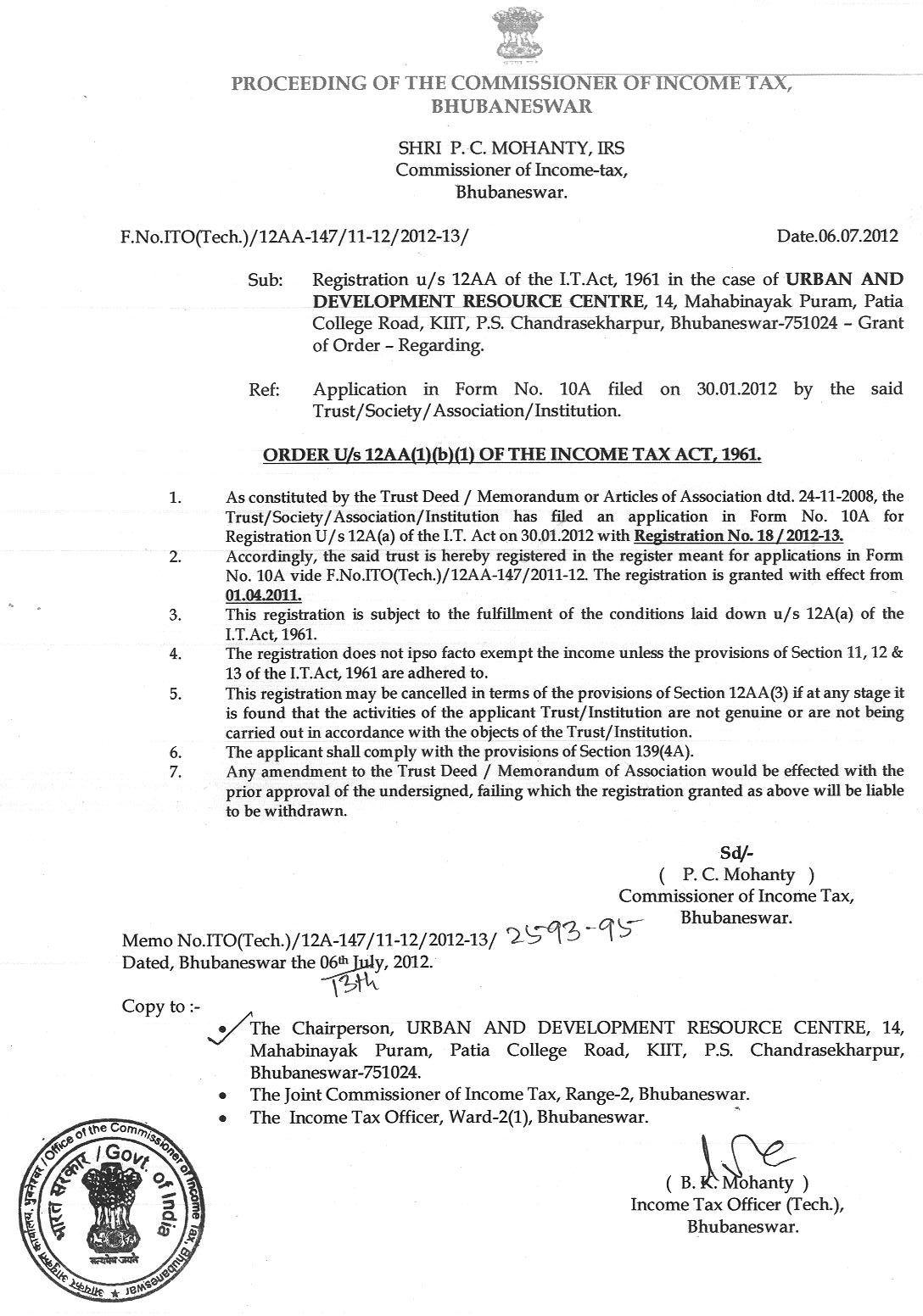 The Urban and Development Centre is registered under the Indian Trust Act 1882 (Registration No. 1883) as of 2008. Memorandum of Association of UDRC is available upon request. 80G certificate is also renewed and available.